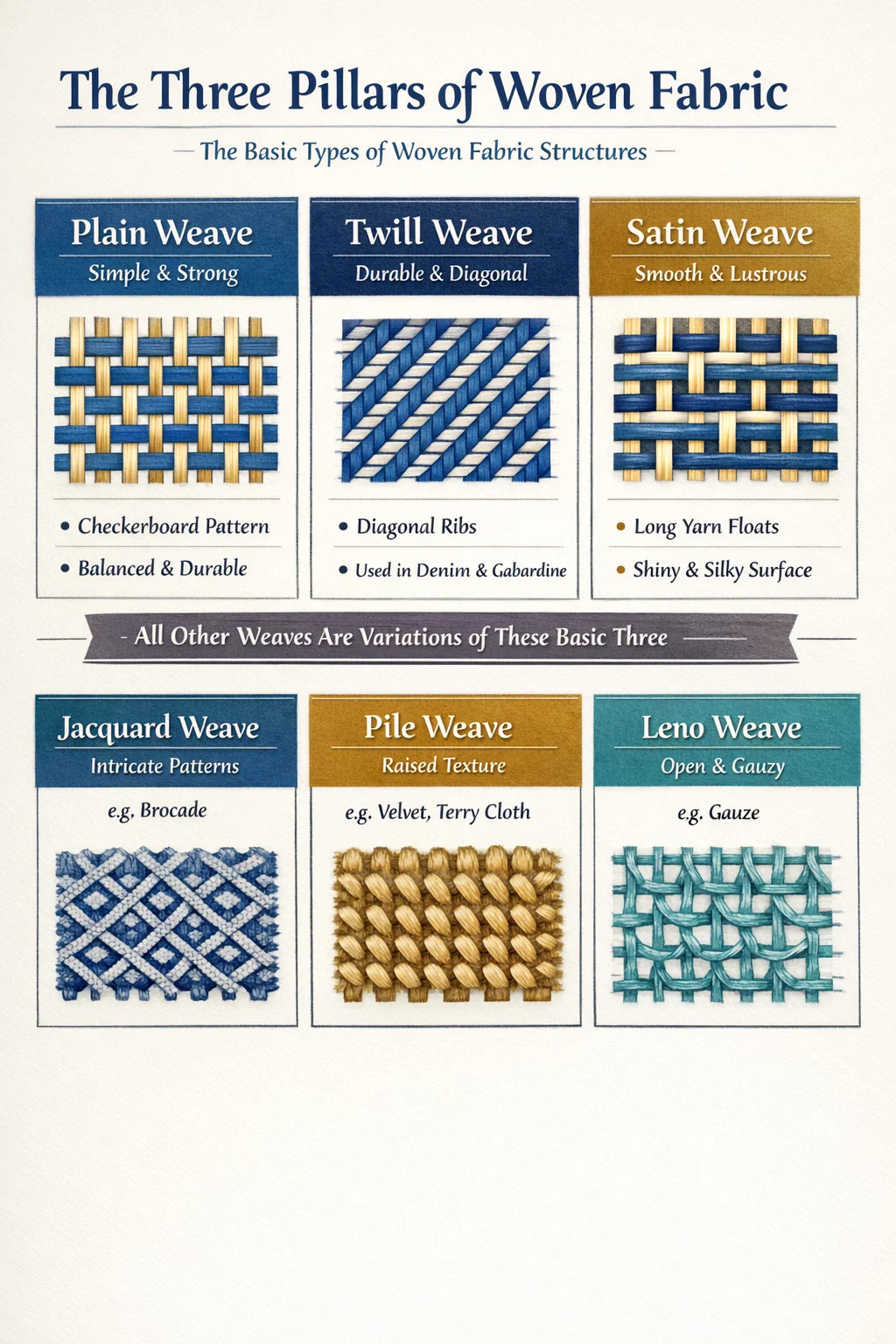 テキスタイルには何百もの特定の市場名がありますが、技術的には 3つの基本的な織物タイプ 他のほとんどすべての構造が派生する構造: 平織り、綾織り、朱子織り 。ジャカード織り、ドビー織り、パイル織りなどの他のバリエーションはすべて、これら 3 つの基本的なインターレース パターンを複雑に変更したものです。これらのカテゴリーを理解することは、繊維製品の耐久性、ドレープ性、実用性を特定するために不可欠です。