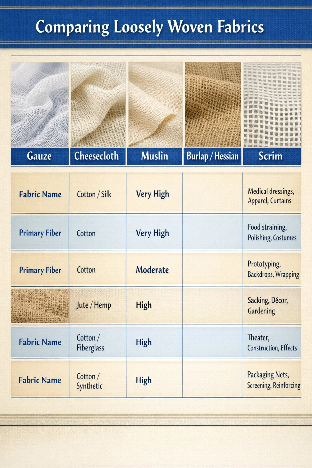 以下の表は、選択を容易にするために、最も一般的な緩く織られた生地の主要な特性と主な用途をまとめたものです。