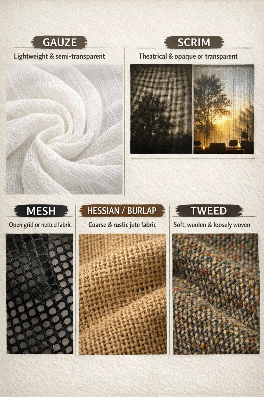 について話すとき 織物 「緩い質感と大きな隙間」を備えたものは、用途や外観に応じて、非常に具体的な用語がいくつかあります。