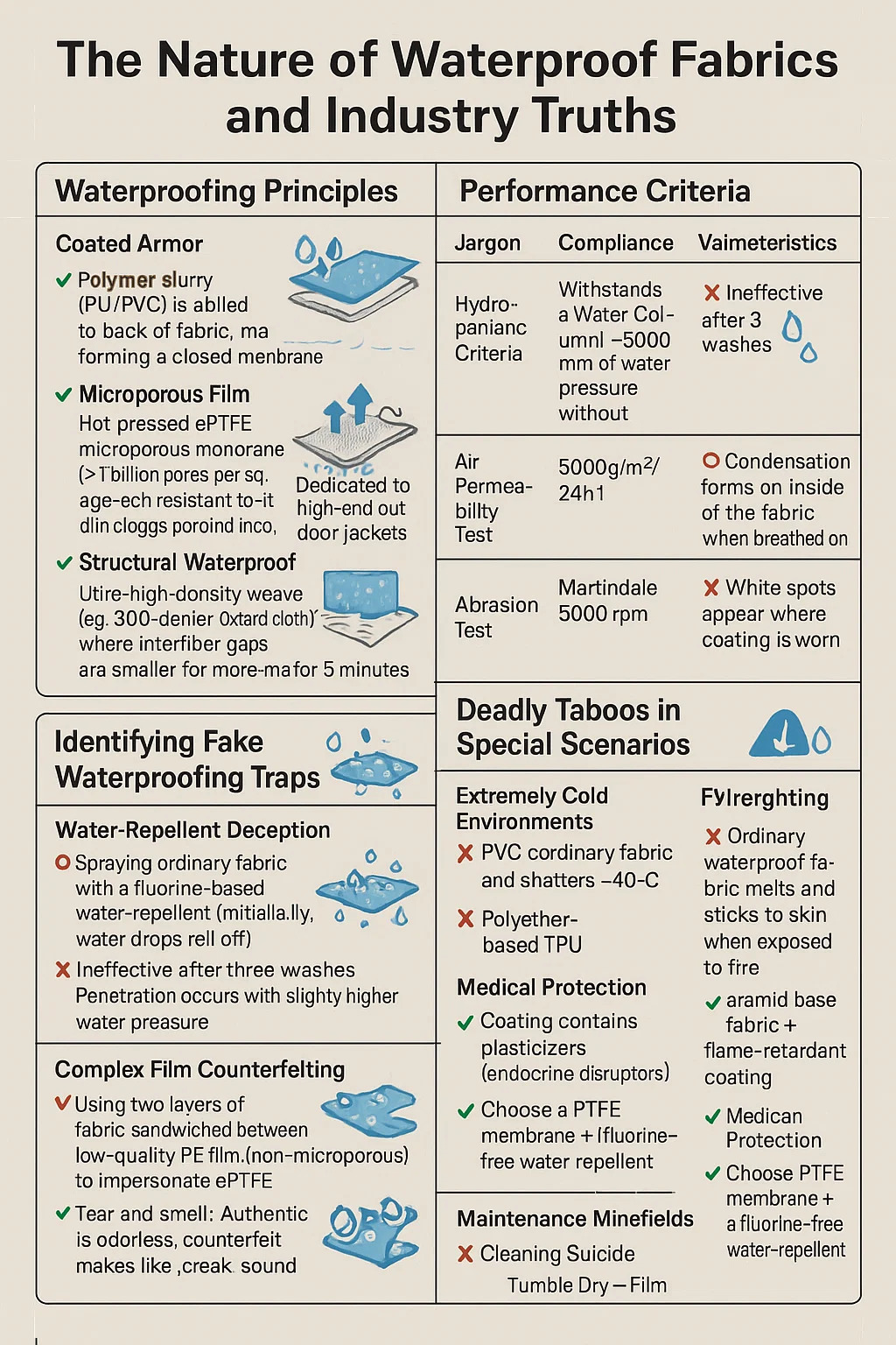 構造防水: 繊維間の隙間が水分子の圧力より小さい超高密度織り (例: 300 デニールのオックスフォード生地)。 ** 耐久性 ** 5 分を超える暴風雨には耐えられません。